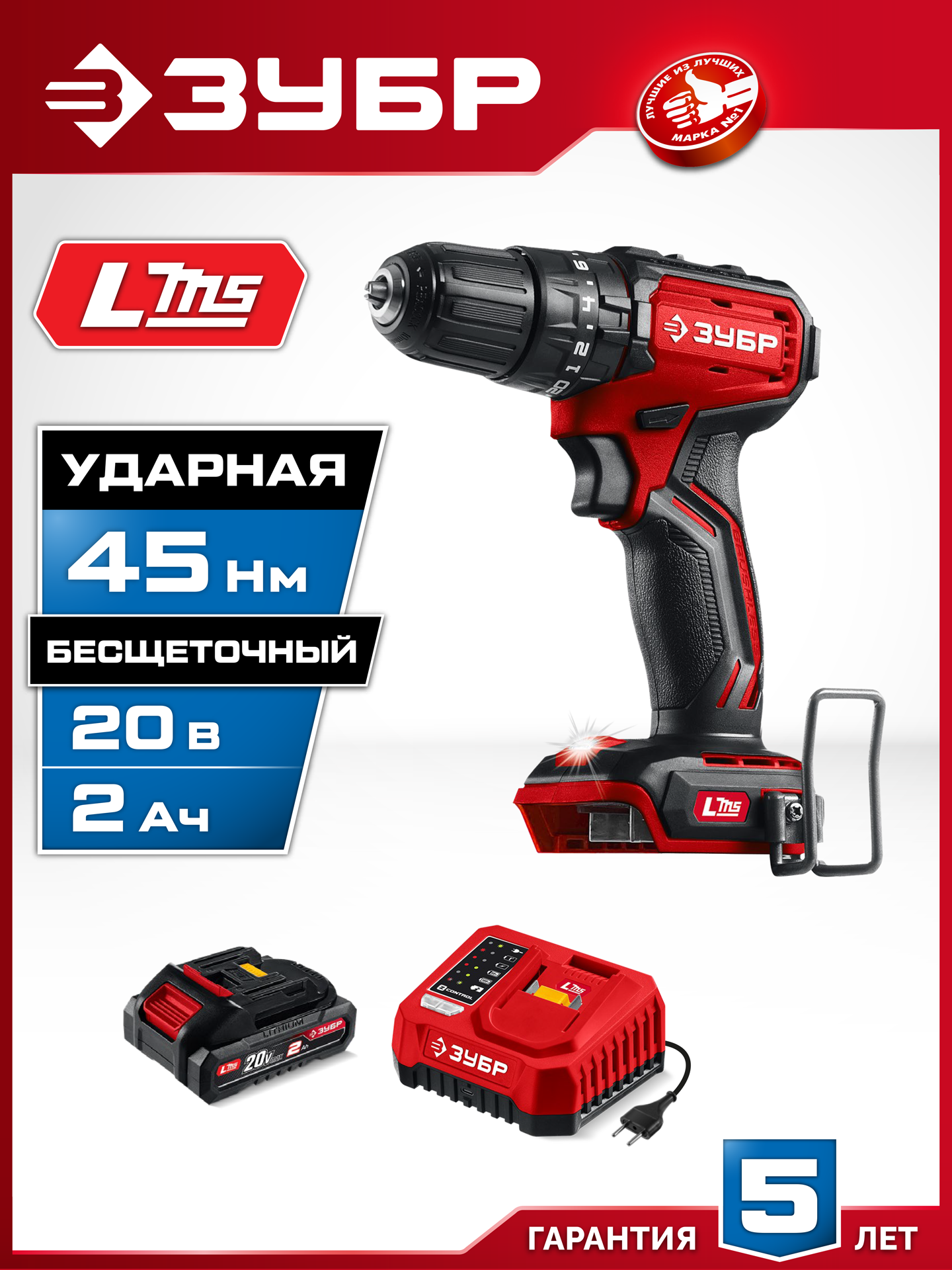 Бесщеточная ударная дрель-шуруповерт ЗУБР 20 В, 45 Н·м, 1 АКБ LMS (2 А·ч)
