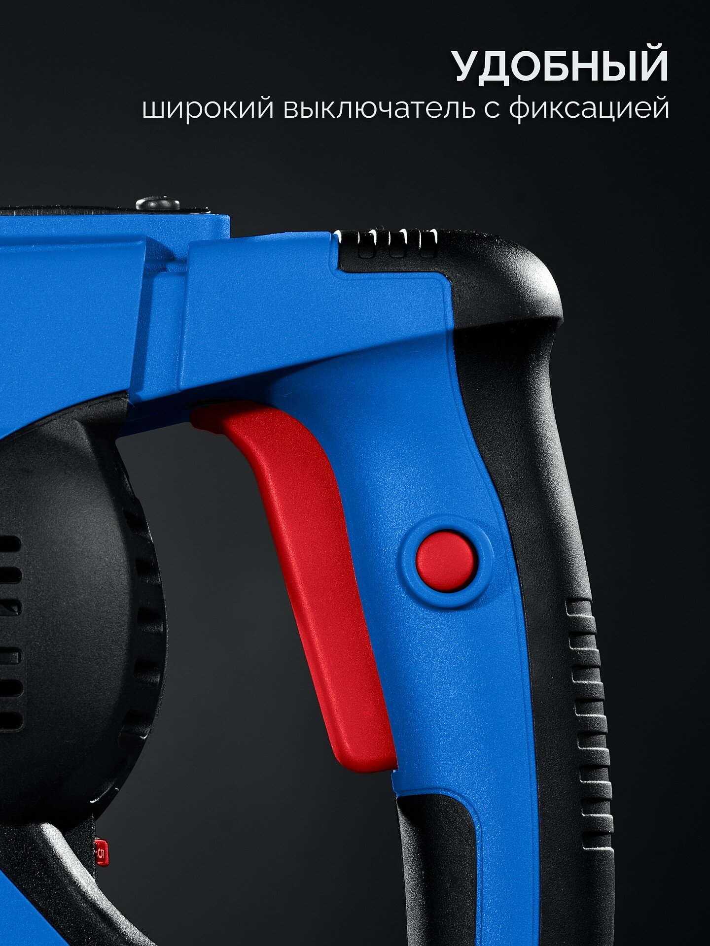 Особенности конструкции: металлический корпус редуктора, патрон SDS-Max, предохранительная муфта, дополнительная рукоятка, индикатор износа угольных щеток.