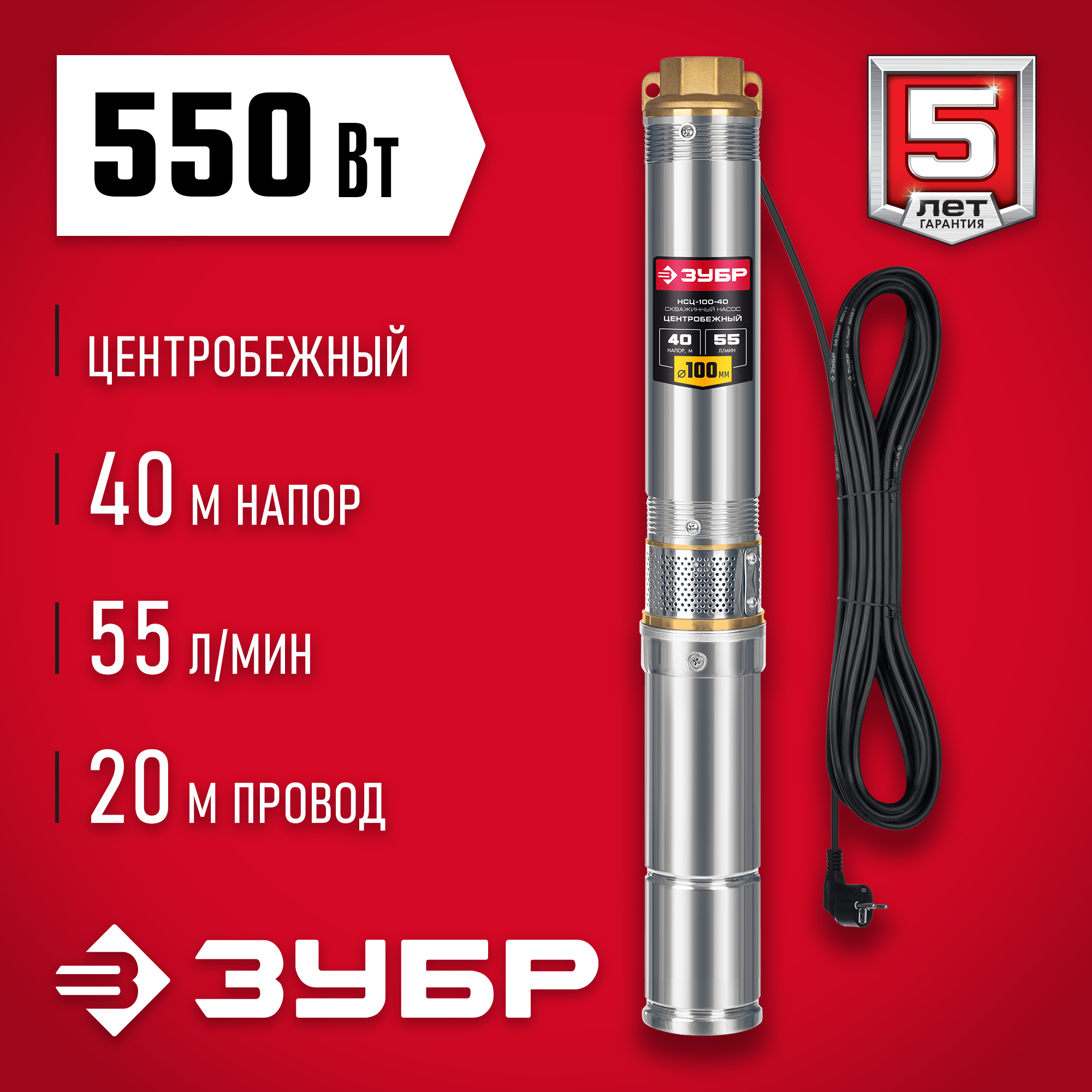 ЗУБР 550 Вт, 40 м напор, скважинный центробежный насос, корпус из нержавеющей стали (НСЦ-100-40)