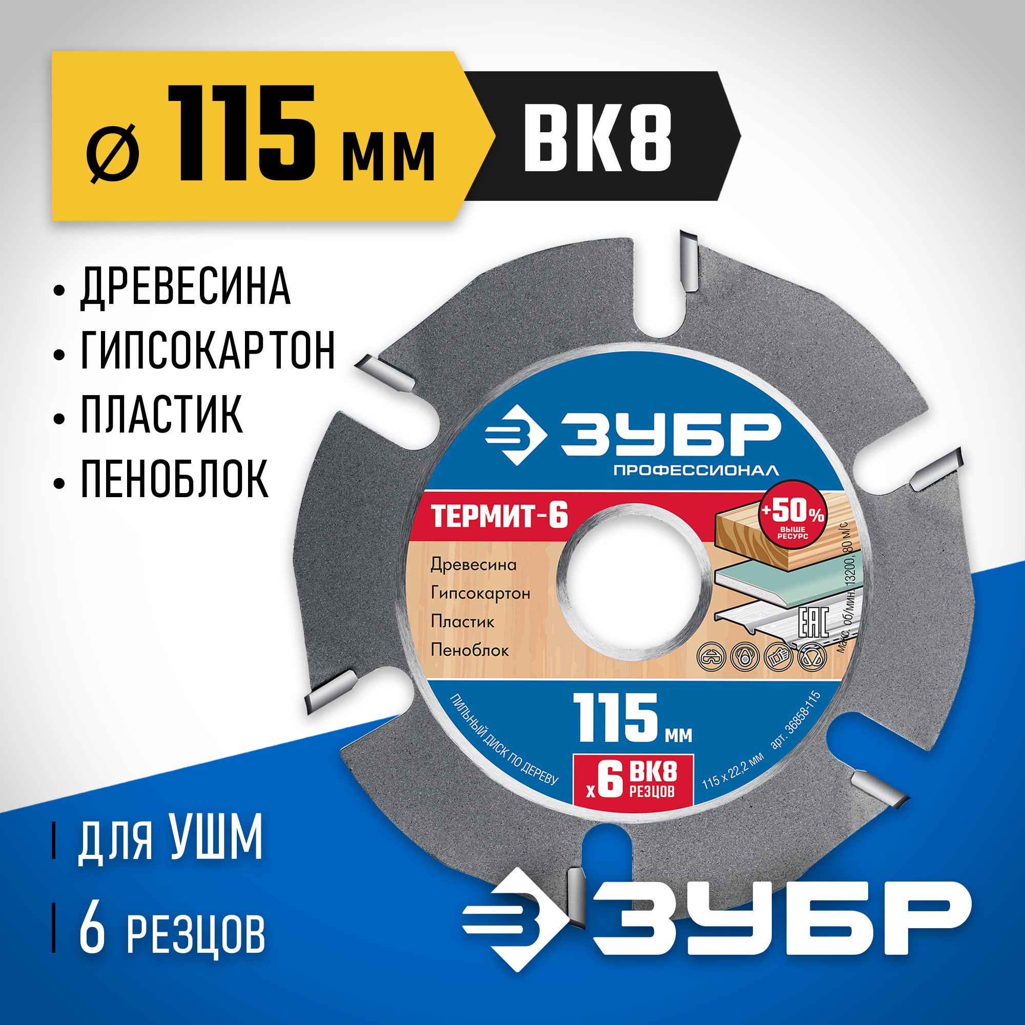 ЗУБР Термит-6, 115 х 22.2 мм, 6 резцов, для УШМ, усиленный, пильный диск по дереву, Профессионал (36858-115)