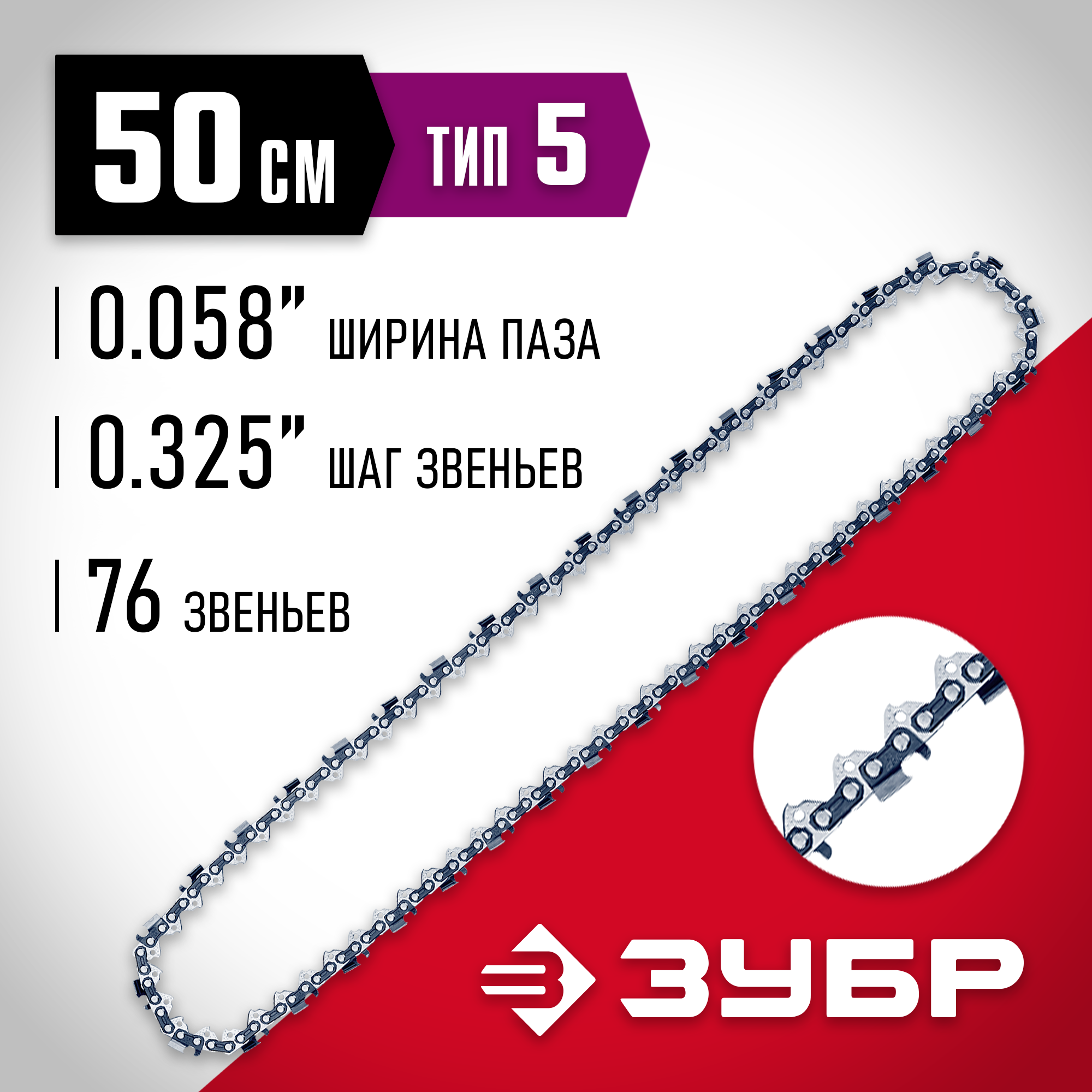 ЗУБР тип 5, шаг 0.325″, паз 1.5 мм, 76 звеньев, цепь для бензопил (70305-50)