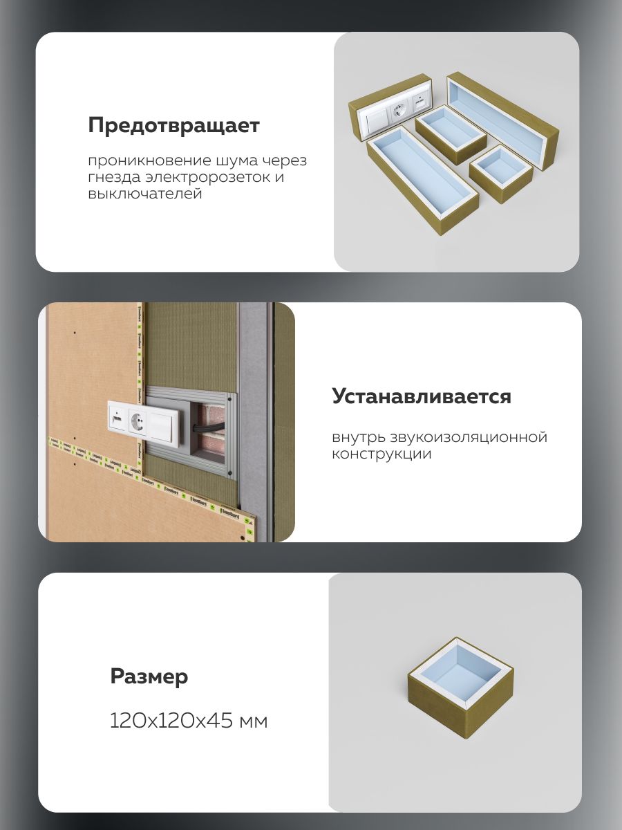 Основные размеры подрозетника составляют 120х120х45 мм, что делает его универсальным для установки в различных типах помещений. Инновационная конструкция SoundGuard M-BOX 1 эффективно блокирует звуковые волны, создавая благоприятную акустическую среду. Вы можете использовать его в сочетании с различными аудиоустройствами и электрическими приборами, обеспечивая не только защиту от посторонних шумов, но и улучшение качества звука.